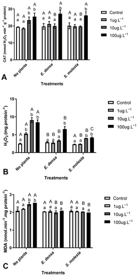 Effects of Cipro on oxidative stress markers in Desmodesmus subspicatus cells exposed to water contaminated with Cipro at increasing concentrations (Control, 1, 10, and 100 µg L−1), with or without prior treatment using Egeria densa or Salvinia molesta plants. (A) Catalase activity; (B) Hydrogen peroxide concentration; and (C) Malondialdehyde concentration (lipid peroxidation). The values are represented as the mean ± standard error of four replicates. Lowercase letters indicate significant differences in Cipro concentrations within the same treatment system, while uppercase letters indicate significant differences between treatment systems within the same Cipro concentration, as determined by the post-hoc Tukey test (considering p ≤ 0.05).