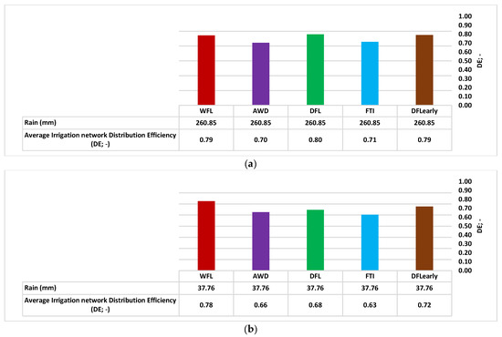 | DE | Distribution Efficiency of the irrigation network (-). |