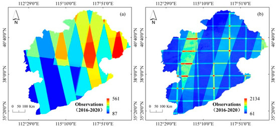 Image observation frequency distribution map of the Haihe River Basin: (a) S1 observation frequency distribution map, and (b) S2 observation frequency distribution map.