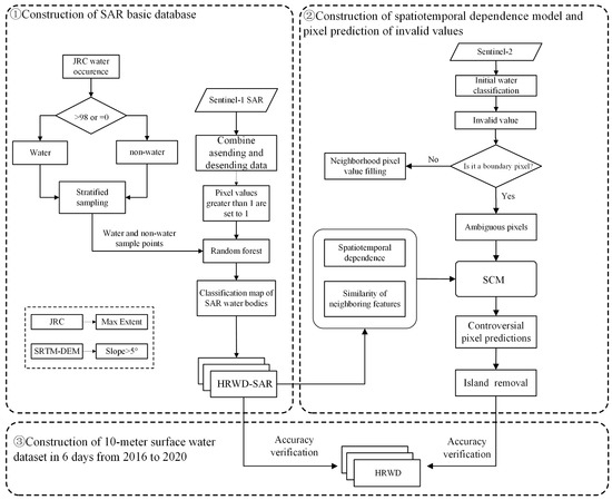 Under the combined effects of natural mechanisms and human interference, the water cycle mechanisms in different basins exhibit different spatiotemporal evolution patterns. As an important element of the water cycle system, surface water bodies not only play a significant role in accurately describing the land water cycle but also greatly affect the water cycle as a whole [1]. High-precision and high-frequency spatiotemporal distribution information concerning surface water bodies can help hydrological and remote-sensing scientists gain new perspectives to understand and reveal global and regional water cycle mechanisms under the combined effects of climate change and strong human interference [2,3,4]. This requires the support of surface water bodies datasets with high spatiotemporal resolutions.