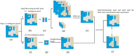 The above operations (Figure 4i) were repeated until all the invalid pixel values were filled. The final water classification results will be updated in the basic database. For areas where the prediction results have broken small patches leading to weak water connectivity, this study calculated the Water Occurrence () based on the generated multi-temporal water data and selected the water distribution range when the = 1, which is the minimum water range, to fill in the locally unconnected areas. The calculation of was performed as follows: