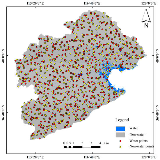 Since the water area accounts for a relatively low proportion of the total land surface area, randomly generating sample points within a large range of the river basin would result in only a very small number of points falling within the water area. Therefore, when generating verification sample points, in order to reduce the complexity of processing a large amount of data, we propose a verification sample point generation scheme for the minimum bounding rectangle area within the boundary range of the Haihe River Basin, supplemented by the JRC’s maximum extent water product as a spatial reference. This mainly includes four steps. First, the entire study area is divided into 100 small blocks. Second, 5000 sample points are randomly generated in each block, ensuring that the points are evenly distributed and random in space. Third, the sample points in the block area are screened, with two random points retained in the water area and one random point retained in the non-water area. Fourth, a visual inspection of the block samples is performed, and the sample points with mismatched labels between the sample point and the actual image feature are corrected using the corresponding high-resolution Google Earth imagery of the same date.