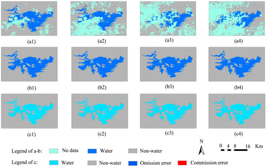 In this study, the Miyun Reservoir is selected for experiments to test and quantitatively evaluate the effectiveness of the proposed method. In the simulation experiment, we simulate four different cloud cover conditions (10–20%, 20–30%, 30–50%, and 50–80%) on the original cloud-free water classification map (Figure 6(a1–a4)). Then, we reconstruct the cloud-affected classification map based on the spatiotemporal correlation model, with the specific results shown in Figure 6(b1–b4). The reconstructed water distribution results for the Miyun Reservoir are compared with the actual water distribution results extracted from the S2 water bodies (Figure 6(b1–b3)), and IoU statistics are performed (see Table 3). The results show that the average IoU for the SCM under different cloud coverages is 0.983, the average omission rate is 0.014, and the average commission rate is 0.015. As can be seen from the distribution results concerning the commission and omission errors in the water reconstruction maps shown in Figure 6(c1–c4), it is not difficult to see that the reconstruction results have reasonably reconstructed the cloud-affected pixels, with only minor differences from the actual S2 water distribution results at the edges. In terms of the statistical results, these differences are shown as omissions (blue) or commissions (red). The actual omission and commission errors relative to the actual water body statistics are part of the changes in the water body during its temporal evolution. This part is distributed along the edge of the Miyun Reservoir water body and is consistent with the water body’s evolution law and process, which is reasonable.