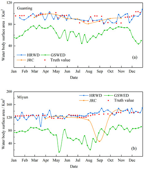 Validation of the water bodies in the Haihe River Basin in 2018: (a) Guanting, and (b) Miyun.