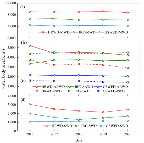 According to the literature, when the annual water occurrence is 0.25, the pixel is classified as an effective surface water body, forming the maximum water body extent; when the annual water occurrence is 0.75, the pixel is classified as a permanent water body extent, which is also the minimum water body extent; and when the annual water occurrence ranges from 0.25 to 0.75, the pixel is classified as a seasonal land surface water body [50,51]. Based on the HRWD, the maximum water body area, average water body area, permanent water body area, and seasonal water body area in the Haihe River Basin from 2016 to 2020 all show a decreasing trend (Figure 8). The maximum water body area is 9019.848 km2, and the minimum permanent water body area is 2908.338 km2. Comparing the areas of different water body types calculated based on the JRC and GSWED, it can be seen that the water body areas monitored by the HRWD and JRC are the closest, demonstrating the strength of the HRWD in revealing detailed spatial and temporal changes in surface water, identifying seasonal changes in surface water bodies and capturing more dynamic features of surface water bodies, implying its potential for long-term high-frequency analysis of the water environment.