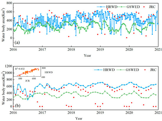 Plots of the area of water bodies larger than 20 km2 in the Haihe River Basin with time series from 2016 to 2020: (a) 6-day temporal resolution (HRWD), 8-day temporal resolution (GSWED), and monthly scale JRC water body area with time series, and (b) monthly scale HRWD, GSWED, and JRC water body area with time series.
