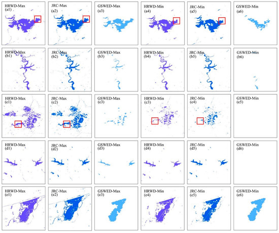 Maximum annual water body extent (Max) and permanent water body extent (Min) for the HRWD, GSWED, and JRC in the five typical water bodies in the Haihe River Basin in 2020: res-ervoirs (a1–a6), rivers (b1–b6), lakes (c1–c6), mountainous water bodies (d1–d6), and urban water bodies (e1–e6). The red box indicates low-water occurrence water body areas.