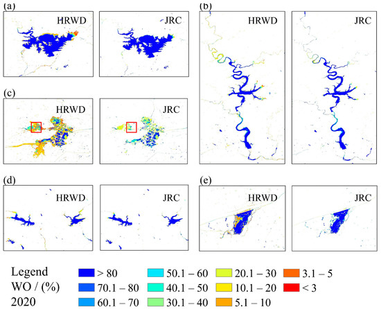 (a–e) The annual water occurrence maps from the HRWD and JRC in five typical water bodies of the Haihe River Basin in 2020. The red box represents the comparison of the water occurrence maps of water flooding between HRWD and JRC at the same location.