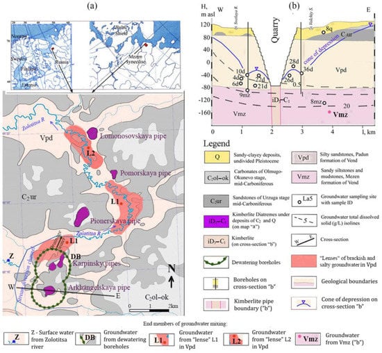 (a) General location of the study site showing the end members involved in the mixing of the surface waters of Zolotitsa River (Z) with fresh groundwater pumped from dewatering boreholes (DBs); brackish and salty groundwater pumped from “lenses” in the Vendian Padun Formation (L1 and L2); and (b) salty groundwater pumped from the Vendian Mezen Formation (Vmz).