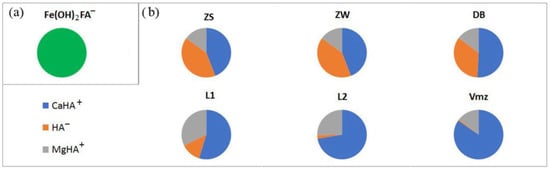 Main aqueous species of (a) fulvic acids and (b) humic acids in the natural waters of the study area (%).