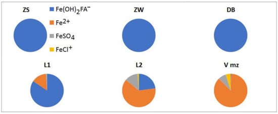 Fe has a high affinity for organic matter and ranks first among competitive complex formations in all landscape-climatic zones [42]. Accordingly, when calculating, it is complexed with FA2− in the first place, taking from the balance of the FA entered into the model everything that can be pulled onto itself. The FA2− remaining in the solution is generally distributed over other metals, but in our case, this is not observed, due to the rather high content of Fe.
