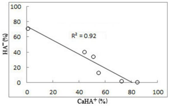 Relationship between HA− and CaHA+ (%) in the natural waters of the study area. R2 is the coefficient of determination.