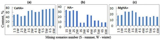 Humic acids, as in natural waters, are distributed more evenly over different elements. The proportion of HA− is maximal in the form of CaHA+, rising from 42.43 in 2S to 76.2% in 6W (Figure 6a) relative to the total HA content, which is significantly higher than in natural river waters (43.94%) (Figure 3b). The difference between summer and winter periods is insignificant (2–6%), and in winter the relative percentage of CaHA+ is higher than in summer. This pattern is observed because we are considering the percentage of complexes relative to the total content of HA in the system. Since the total HA content in the river is lower in winter than in summer, most of it is complexed with metals.