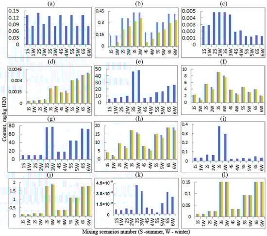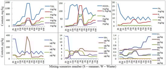 The content of organo-mineral complexes in the form of MgHA+ in the mixture of river waters with drainage waters (14.89–26.01%) (Figure 6c) is comparable to their content in natural river waters (15.02%). In addition, ZnHA+ is present in the mixed solutions according to scenarios 1 and 2 in an amount of 0.08–0.13%, decreasing to 0.04–0.01% according to scenarios 3–6, which is significantly lower than in natural river water (0.33). SrHA+ is set in the amount of 0.01% only in the mixed solutions according to scenarios 1–3. NA− in free form is contained in the amount of 30.93–33.03% in the mixed solutions according to scenarios 1 and 2, and decreases to 8.2–23.58% according to scenarios 3–6 (Figure 6b), which is significantly lower than in the natural waters of the river (40.67). This is due to an increase in the concentrations of Ca, Mg, Zn, and Sr in the mixed solutions compared to their concentrations in river waters. In other words, in the mixed solutions, metals, which mainly come from discharged groundwater, are complexed with organic matter, which is contained in river waters. The formed organo-mineral complexes are very stable, and the metals complexed in them can migrate in this form over long distances.