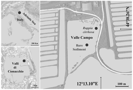 The samplings were carried out from June to December 2017 at Valle Campo with a roughly fortnightly frequency. Two sites were considered, one with Ruppia meadow (44°38.257′ N; 12°13.075′ E) and one with bare sediment (44°38.216′ N; 12°13.056′ E). The two sites were approximately 200 m apart (Figure 1). Valle Campo is a choked basin, which is not affected by tidal excursions. The study area has a rough basin shape, shallower at the edges and deeper in the center. The Ruppia site, closest to the edge, has a depth of between 20 and 30 cm, while the bare sediment site, more towards the center of the basin, has a depth of about 50 cm. The sediments consist of silty–clayey sand.