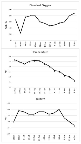 Water parameters showed a clear seasonal trend and were obviously identical at the two sites, given the short distance. Temperature varied between 27.8 and 6.6 °C. Dissolved oxygen saturation varied between 88% and 23.6%. Salinity varied between 40 and 27 PSU. Figure 2 shows the values of water parameters.