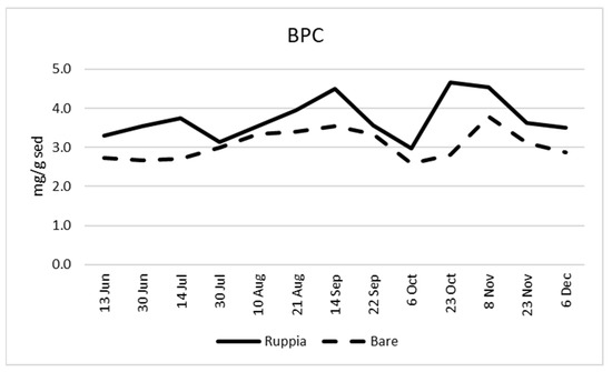 Sediment content of biopolymeric C at the Ruppia and bare sites (Jun: June, Jul: July, etc.).