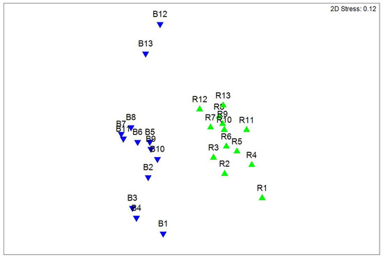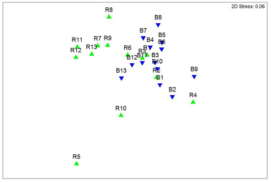 The nMDS ordination of the sedimentary characteristics indicated a clear separation of the different sites, with the site points almost entirely segregating into two separate clouds (Figure 4). Only on the first dates (June) did the Ruppia site seem undifferentiated from the bare site, as they are interspersed in the plot. Then, over time, the sedimentary characteristics between the R and B site differed and site points segregated separately in the ordination plot.