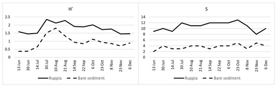 Shannon–Wiener’s diversity (H’) and species richness (S) at the Ruppia and bare sediment sites (Jun: June, Jul: July, etc.).