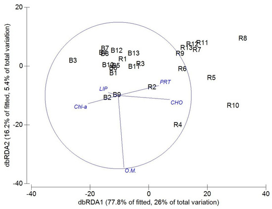 Only a relative part of the observed variation in the macrofauna assemblages was explained by sediment variables, particularly by CHO and PRT (DistLM model explained 18.5% and 11.5% variation, respectively). The first two dbRDA axes captured nearly 31% of the total variation in the data cloud (Figure 7)—the plot showed quite a clear separation of bare and Ruppia sites, the latter being associated with higher values of CHO and PRT.