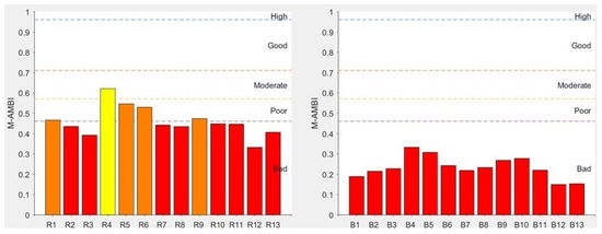 The ecological quality status at both sites was assessed by the macrobenthic community by applying the M-AMBI [20] index. Valle Campo is a choked and non-tidal sub-basin; therefore, the reference values for the status “High” are AMBI = 1.85, H′ = 3.3, S = 28 (as defined by the Italian Ministerial Decree D.M.260/10).