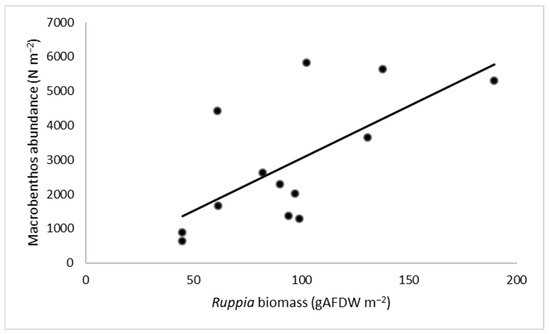 Ruppia biomass oscillated between 189.5 (13 June) and 44.7 (6 December) gAFDW m−2. At the Ruppia site, the abundance of macrobenthos oscillated between 5647.7 (10 August) and 638.3 (23 November) individuals m−2. There was a significant relationship (regression ANOVA; r = 0.66, p < 0.05) between the amount of Ruppia biomass and the abundance of macrobenthos (Figure 9).