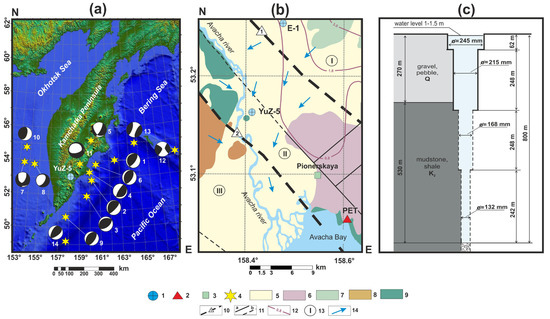Location and structure of the YuZ-5 well, geologic setting, epicenters and focal mechanisms of local earthquakes according to NEIS (https://earthquake.usgs.gov/earthquakes/search (accessed on 20 January 2023)), GlobalCMT (https://www.globalcmt.org (accessed on 20 January 2023)) and the Kamchatka Branch of the Geophysical Survey of the Russian Academy of Sciences (http://sdis.emsd.ru/info/earthquakes/catalogue.php (accessed on 20 January 2023)). (a) Location of the YuZ-5 well, epicenters and focal mechanisms of 1997–2020 earthquakes (Table 3 and Table 4). (b) Geological environment according to [22,23,24] with authors’ additions. Designations: 1—observation well, 2—Petropavlovsk (PET) seismic station, 3—Pionerskaya meteorological station, 4—earthquake epicenters, 5–9—geological formations (5—Quaternary sedimentary deposits, 6—Quaternary volcanogenic deposits, 7—Quaternary lavas of modern volcanoes, 8—Neogene volcanogenic-sedimentary rocks, 9—Late Cretaceous metamorphosed volcanogenic-sedimentary rocks), 10—regional faults (1—Avachinsky, 2—Petropavlovsky), 11—faults (a—established, b—assumed), 12—depth to the metamorphosed basement in km, 13—tectonic structures (I—Avacha volcano-tectonic depression, II—Petropavlovsky horst, III—Nachikinskaya zone of fold-block dislocations), 14—direction of regional underground runoff. (c) Well structure and geological section.