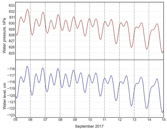 In stage III, when level measurements were replaced by groundwater pressure measurements, synchronous measurements were carried out with two sets of equipment for six months from August 2017 to February 2018. The water level was measured by highly sensitive ultrasonic sensor as part of the Kedr DM equipment. The pressure was measured with a hydrostatic pressure sensor (Table 2). The obtained time series of groundwater level and pressure were averaged over hourly time window, and adaptive compensation of barometric variations was performed in average hourly series based on estimate of the complex transfer function from atmospheric pressure variations to water level changes [38,40,41]. Figure 2 shows a 10-day fragment of synchronous average hourly time series of water level and pressure with compensated barometric influence. Figure 2 shows a complete similarity of groundwater pressure variations in the well recorded by two different sets of equipment. The value of correlation coefficient between variations of time series during the 6-month observation period by two sets of equipment was 0.99, and the value of coefficient of linear relationship between them by the least squares method was 1.02 cm of the water column/hPa.