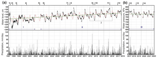 Average hourly groundwater pressure variations in well YuZ-5 (black line) in comparison with daily precipitation at the Pionerskaya meteorological station (Figure 1b) and earthquakes (shown by vertical arrows, earthquake numbers according to Figure 1a, Table 3) in September 1997–February 2018 (a) and in October 2017–July 2022 (b). I, II, III—stages of observations shown in blue lines (Table 2). The vertical axis of the upper graph (a) shows the water level position from the top of metal cap (75 cm height) above the wellhead. The vertical axis of the upper graph (b) shows groundwater pressure changes at a depth of 8 m below the water level in the wellbore. Gray dotted rectangles with numbers 1–3 highlight fragments of observations, which are given below in more detail. Groundwater pressure variations in (a,b) are shown in comparison with the seasonal head change function (pink line) calculated over a 14-year observation period (2004–2017) and average linear trends (green lines) estimated for the observation periods 1997–2018 (a) and 2017–2022 (b).
