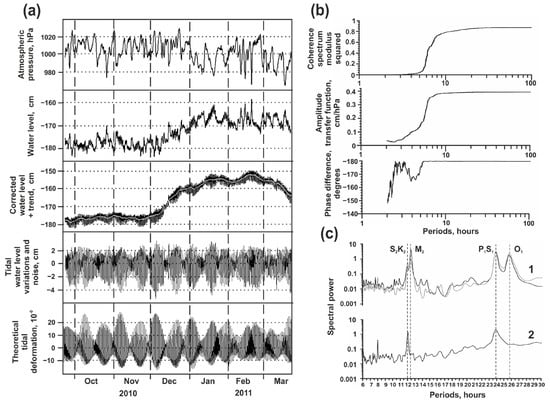 An equally important element of the method for processing and analyzing water level/pressure observations in open piezometric wells is a detailed study of the tidal and barometric responses in a wide range of periods, providing the assessment of deformation properties of the observed “well–aquifer” system as well as broadening the options of using well observation data in various studies of seismo-hydrogeodynamic effects in the framework of conceptual models.