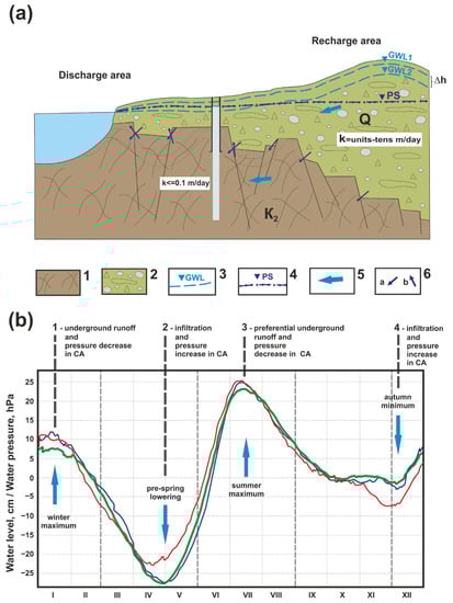 On Figure 3, changes in groundwater pressure are presented in comparison with the seasonal function of head change calculated over a long period of continuous observations (see Section 2.3), together with linear trends for the observation periods 1997–2018 (Figure 3a) and 2017–2022 (Figure 3b). Linear trend rates in water pressure changes were 2.2 cm/year (increase) for the observation period 1997–2017 and −0.5 hPa/year (decrease) for the observation period 2017–2022.