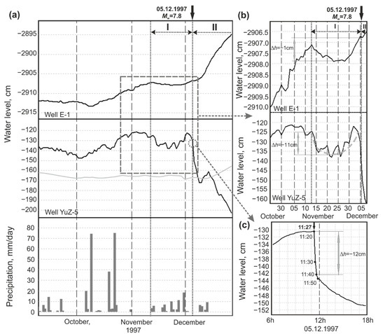 Before the events of 5 December 1997, Mw = 7.8 (No. 1 in Table 3, Figure 1a), and 30 January 2016, Mw = 7.2 (No. 11), anomalous water level variations were manifested for about 20 and 90 days. Such water level changes were considered as the supposed hydrogeodynamic precursors when compared with the seasonal function behavior of the groundwater head estimated over a long period [29,34,35]. Data processing method to evaluate such a function is presented in Section 2.3. In the cases of both earthquakes, the precursors in the groundwater pressure in well YuZ-5 were confirmed by the manifestation of the hydrogeodynamic precursors in the water level changes in the E-1 well, located 11 km from well YuZ-5 (Figure 1b), as well as in the changes in the chemical composition of the groundwater from deep self-flowing wells [17] and the movements of the GPS stations near the EQ area of 5 December 1997 [35,36].