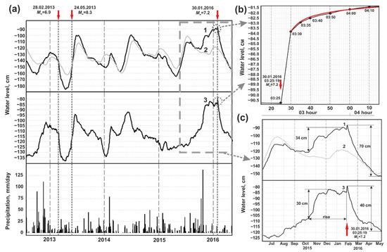 Studies of hydrological effects in connection with earthquakes are widely carried out in the world. The results of such studies were summarized in monographs [1,2]. In these monographs and in many other works [3,4,5,6,7,8,9,10,11,12,13,14,15,16,17,18], it was shown that during observations in piezometric wells equipped with level gauges or pressure sensors, various changes in the groundwater level and pressure were detected, mainly influenced by the seismic waves from the earthquakes. To a lesser degree, such studies investigated the changes in the groundwater pressure before the earthquakes (hydrogeodynamic precursors, HPs) as well as the effects of changes in the static stress state of water-bearing rocks during the ruptures in the earthquake sources (coseismic effects, CSEs).