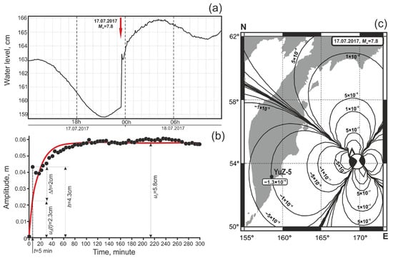 The values of the coseismic deformation in the well area (D1) were estimated based on the amplitudes of water level changes Δh with the use of the value of water level tidal sensitivity Av (Table 5). The sign of deformation was assessed by the directions of the water level change: volumetric compression of water-bearing rocks with an increase in the water level and volumetric expansion with a decrease in the water level [16,28,31]. In Table 3, D1 values are compared with the theoretical estimates of coseismic strain D2 according to the dislocation model [30] with parameters of earthquake sources (Table 4).
