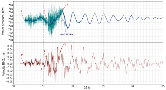 At stage III, during the measurements of water pressure with a frequency of 20 Hz, earthquakes Nos. 13 and 14 occurred, which were accompanied by weak coseismic water pressure changes during ≈20–30 s against the background of a noisy recorded signal by transverse S-waves with amplitudes exceeding the amplitudes of coseismic effects (Figure 9). Using differences between the averaged pressure variations during the manifestation of P-waves and pressure variations after the arrival of L-waves, amplitudes of coseismic water pressure changes were obtained, which approximately correspond to their theoretical estimates.