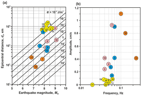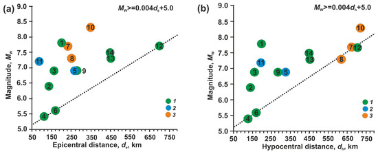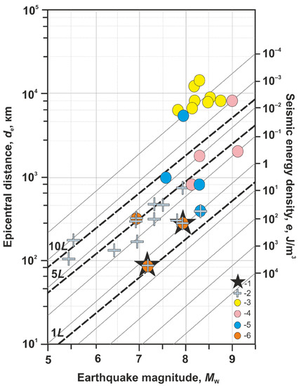 The distribution of distinguished types of SHGEs as a function of magnitude and epicentral distance of the earthquakes, as well as the calculated value of specific seismic energy density e in the area of well YuZ-5, is shown in Figure 14. Figure 14 also shows the values of one (1L), five (5L) and ten (10L) maximum linear sizes of earthquake sources in km, which were calculated using the formula lgL = 0.440Mw − 1.289 [32].