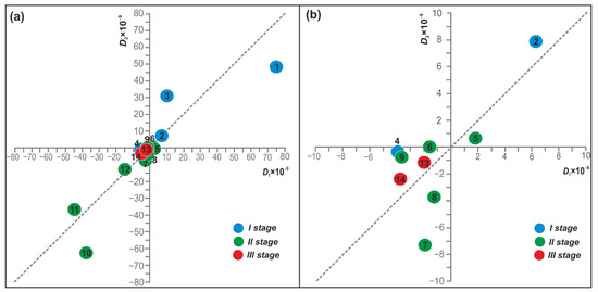As follows from the distribution of D1 and D2 values (Figure 11), both methods for estimating the volumetric coseismic deformation in the well area do not give systematic deviations in the range of values of unity, tens of 10−9, and some difference in their values is determined by estimation errors inherent in both methods [16].