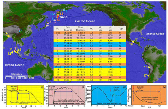 Various water level responses to the passage of seismic waves from the earthquakes with magnitudes Mw = 6.8–9.1 at epicentral distances de = 80–14,600 km were also recorded according to the observations in well YuZ-5. Four types of such hydrogeoseismic water level variations (type I–IV HGSVs) were considered in detail in [18]. In this paper, a summary description of type I–IV HGSVs is given to assess the range of magnitudes and distances of earthquakes accompanied by such types of seismo-hydrogeodynamic effects in the water pressure changes in well YuZ-5.