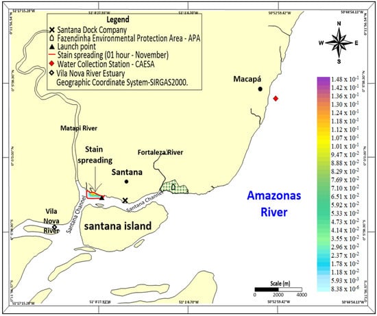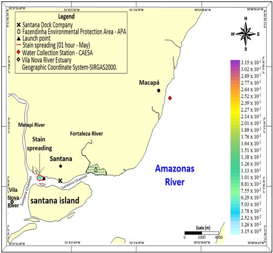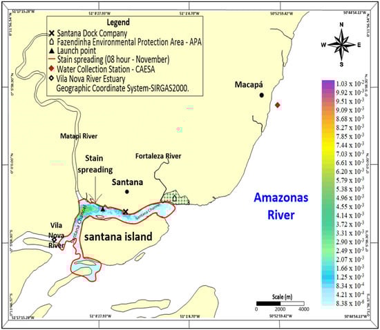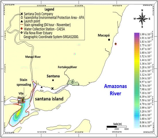In the November scenario (Figure 3 and Figure 4), the plume touched the entire margin of the Fazendinha Environmental Protection Area, while in May the plume extended further downstream, towards the mouth of the Amazon River. Its extension reached the vicinity of the Macapá water intake station facilities, increasing the risks and dangers of environmental and economic impacts and compromising water intake and treatment operations for significant periods [35]. In extreme cases, the Water Treatment Plant—ETA of Macapá would need time and advanced technologies to make the potentially affected water resources less impacted and to make them accessible and useful for consumption again.