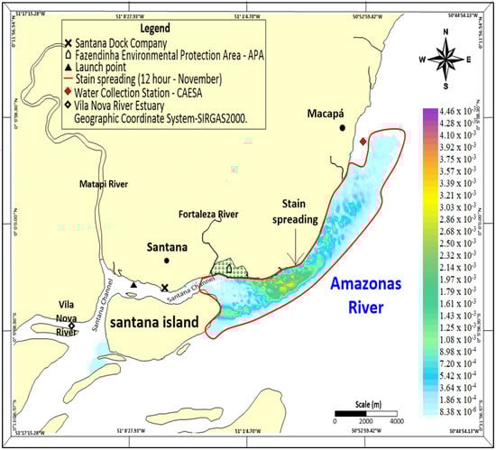 The hypothetical accident is established at the beginning of the pipeline structure, installed in the Port of Santana (latitude: −3.810178°, longitude: −49.560781°). The presence of islands and two large tributaries (the Matapi River and the Vila Nova River) were considered influential initial and boundary conditions in the present simulation [9,13,20,21].