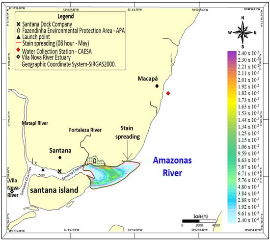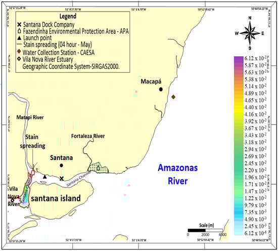 At time t = 4 h, referring to scenario S-1b (Figure 2), the flood tide flow intensifies (westward) when the plume is directed upstream of the dumping point, reaching an area of ≈11.27 km2 and a Santana Channel flow of 10,194.36 m3/s. The impacted areas up to this point were mainly on the west bank, with emphasis on the mouth of the Vila Nova River, a tributary of the Amazon River, where the highest concentrations of oil appeared.