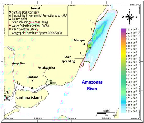 In scenario S-2, which was simulated for the Amazon rainy period (May), Figure 5, Figure 6, Figure 7 and Figure 8 show the results for this period. The simulation took into account similar hydrodynamic characteristics of the tide as in November to enable a comparative analysis of plume spreading. However, during the actual spill, the flow rate of the Santana Channel was 6757.24 m3/s, indicating the end of the ebb tide, similar to the S-1 scenario.