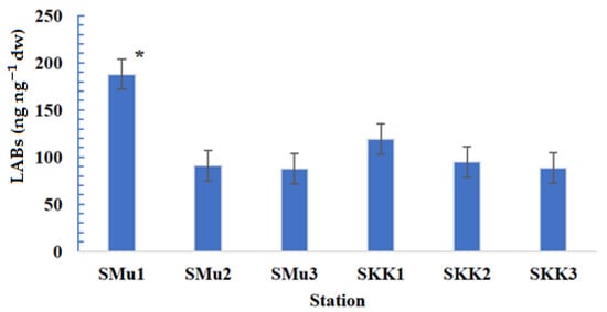 This suggests that LABs may be a reliable indicator of anthropogenic contamination in the marine environment, as shown in Table S1 in the SM File. At p < 0.05, it was consistent with a significant difference in LAB concentration between the research sites (Table 4).