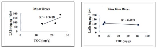 TOC was assessed in all sediment samples, and a relationship between LAB and TOC was observed at several locations, including Muar River, with an R2 value of 0.54 (see Figure 5).