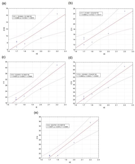 Relationship of (a) the C10 with (I/E), (b) the C11 with (I/E) (c) the C12 with (I/E), (d) the C13 with (I/E), and (e) the C14 with (I/E) (where: C10 = C10 − Labs; C11 = C11 − Labs; C12 = C12 − Labs; C13 = C13 − Labs; C14 = C14 − Labs).
