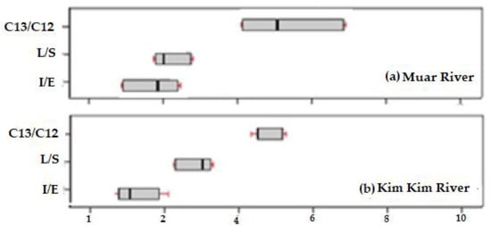 Values of the C13/C12, L/S, and I/E ratios in the samples of the Muar and Kim Kim rivers.