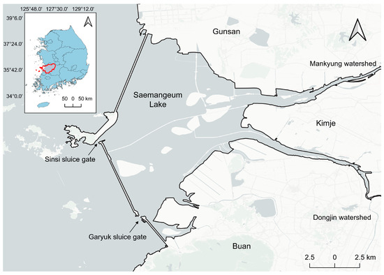 In November 1991, a sea dike was built as part of the Saemangeum project. The Saemangeum sea dike was completed in April 2010, and its final water-barrier work was completed in April 2006. This sea dike spans 33.9 km from Daehang-ri, Byeonsan-myeon, Buan-gun to Bieung-do, Gunsan, and includes estuaries of the Mangyeong (north side) and Dongjin (south side) rivers. It consists of four waterproof dikes and two drainage sluice gates (Shinsi, Gayeok) (Figure 1). The Saemnageum sea dike’s interior has a topographic range of 0–40 m, while the seabed is typically flat. The total area of the Saemangeum project is 401 km2. Based on the management water level elevation of (−) 1.5 m during the completion of the Saemangeum Reservoir waterproof dike construction, the amount of land exposed to the natural elements was 180 km2 or 45% of the total area and 64% of the land area (282.9 km2) [25].