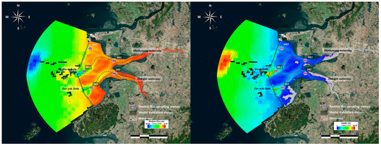 The water depth and terrain data for each grid reflected the internal work by referring to waterproof dike and dredging construction data obtained from a survey conducted in 2008 by the Korea Rural Community Corporation’s Saemangeum project group [30].