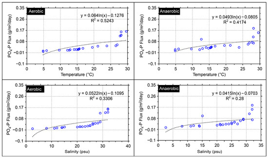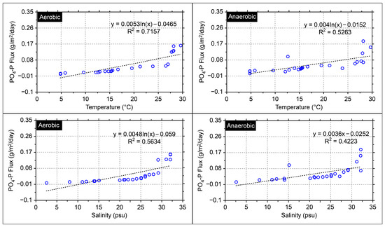 Relationships between water temperature–salinity and flux rate under aerobic and anaerobic conditions (log function).