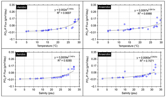Relationship between water temperature–salinity and flux rate under aerobic and anaerobic conditions (exponential function).
